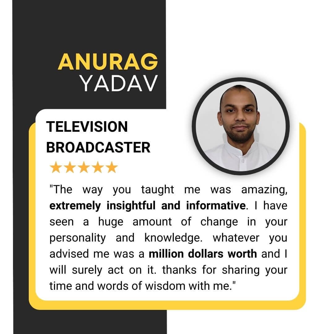 The way you taught me was amazing, extremely insightful and informative. I have seen a huge amount of change in your personality and knowledge. whatever you advised me was a million dollars worth and I will surely act on it. thanks for sharing your time and words of wisdom with me.